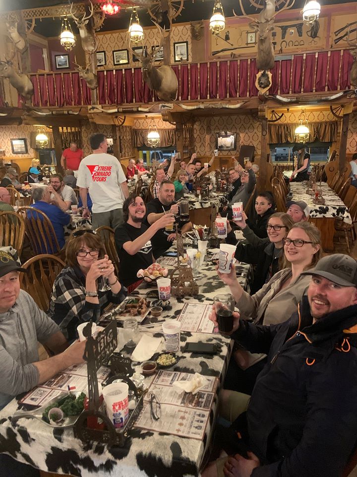 After wrapping up a chase we will travel a bit to a new hotel and will get dinner along the way or nearby after checking in. We realize that some of our guests may have had a full day and would like to get in as early as possible after a long day, and some might like to stay up a bit later and partake in an adult beverage after dinner to celebrate their day. We do our best to accommodate everyone depending on where we end up and at what time of the night we arrive. Once we arrive and get everyone their hotel keys if able time and situation permitting, we arrange dinner plans and have our final meeting of the day that explains our thoughts on the next day’s plans and what time to meet the next morning. Then we start the fun all over again!
