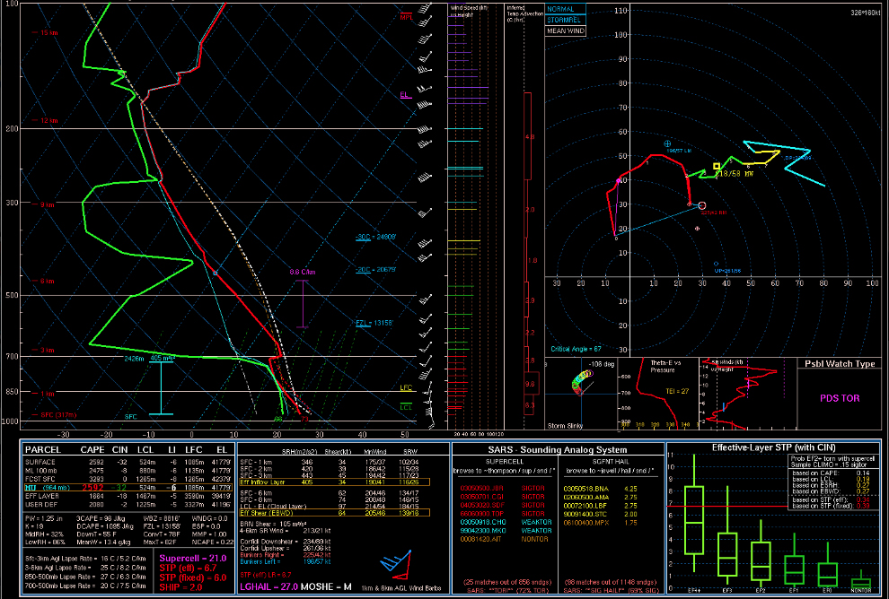 Storm chasing begins with looking at forecast models well in advance of a chase day to begin to see the possibilities of the ingredients required to create notable severe weather. There are many types of forecasting models, but those used by storm chasers the most are numerical weather forecasting models. These models use mathematical processes and current real time weather conditions to create an idea of what might occur in the future with possible weather events. These numerical forecasting models are created by some of the most powerful supercomputers in the world, and for good reason. Their job requires filtering through countless amounts of data to match past events with current weather conditions to create a new “run” based on a mathematical algorithm. For example, let’s say there was a notable tornado event in a certain area in the past.