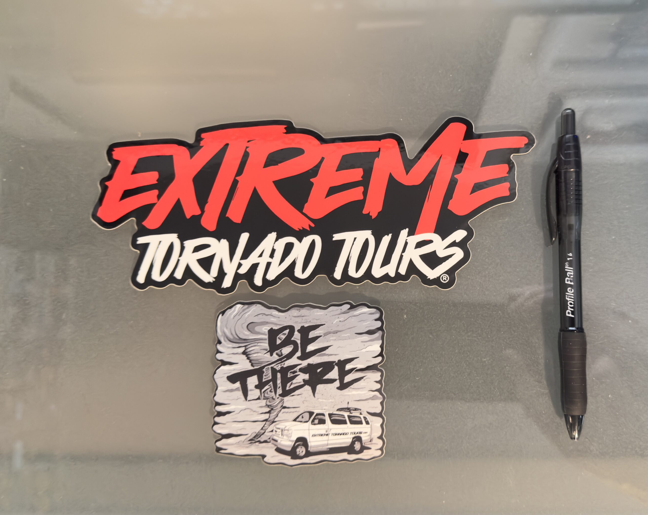 A two pack of decals with our new “Extreme Tornado Tours” logo in a large, 8″ decal, great for bumpers! Also included is our illustrated “Be There” design with our tour van and a tornado in a 3×3″ size. These decals are high quality, die-cut, long lasting vinyl decals that you can get here!