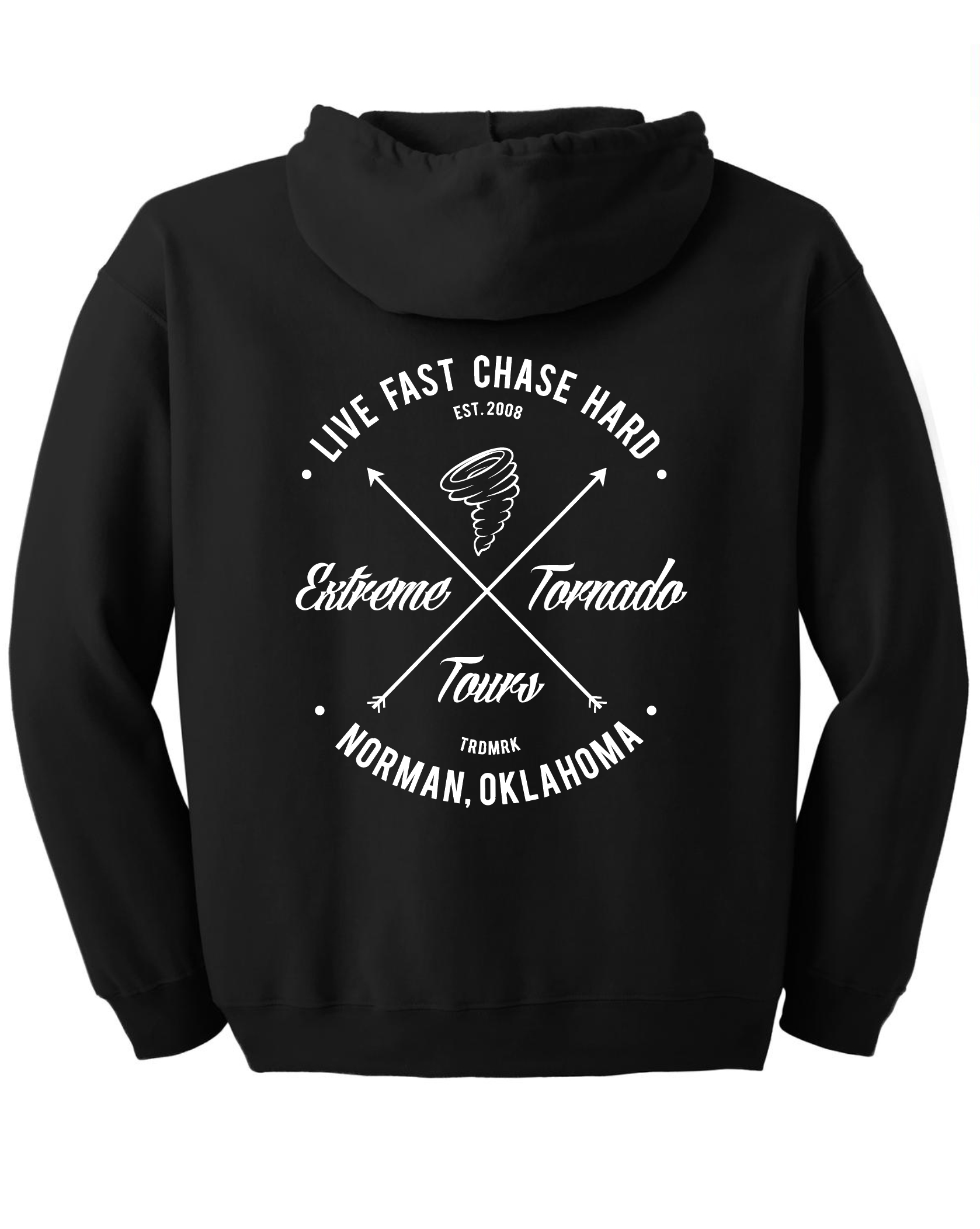 Our flagship Hooded Sweatshirt! This hoodie embodies our foundation here in Norman Oklahoma, the epicenter of severe weather education at Oklahoma University while being home to many notable storm chasers. Our mantra here at Extreme Tornado Tours is emblazoned across the top of the graphic on the BACK of the hoodie; “Live Fast Chase Hard” This is a high quality black Gildan Heavy Blend unisex Hooded Sweatshirt that fits normal.